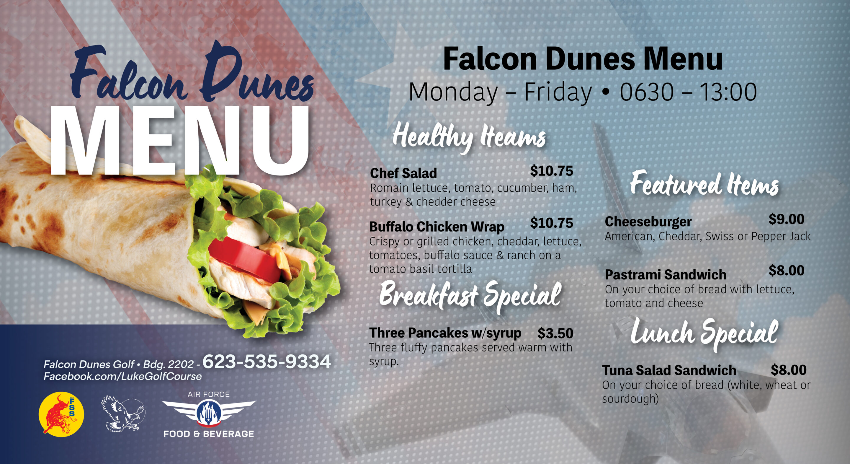 The Falcon Dunes Snack Bar hosts more than just snacks! Our awesome menu and expert chefs will make you want to come and eat here even when you’re not playing a round of golf! We also offer cart-side service with snacks and beverages available for purchase while you’re out on the course, so you never have to leave the greens!